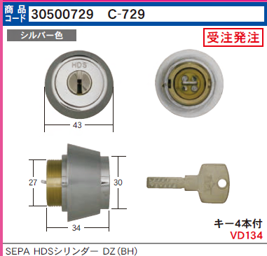 C-729 HDSシリンダー ミワDZ(BH)用 シルバー色